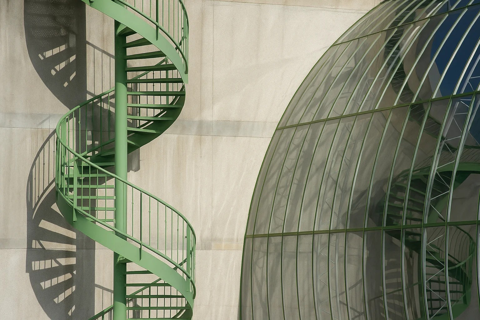 Dieses beeindruckende Foto zeigt eine grüne Wendeltreppe und eine Glaskuppel an einer modernen Fassade – ein Zusammenspiel aus Licht, Schatten und industrieller Ästhetik.