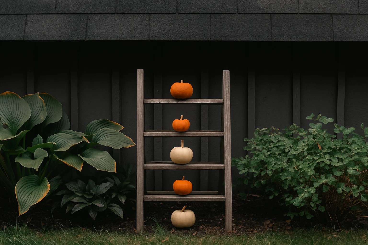 Dieses Bild zeigt orange und weiße Kürbisse, die auf einer Holzleiter vor einer dunklen Wand angeordnet sind. Grünes Laub und warme Herbstfarben sorgen für eine ruhige Stimmung.