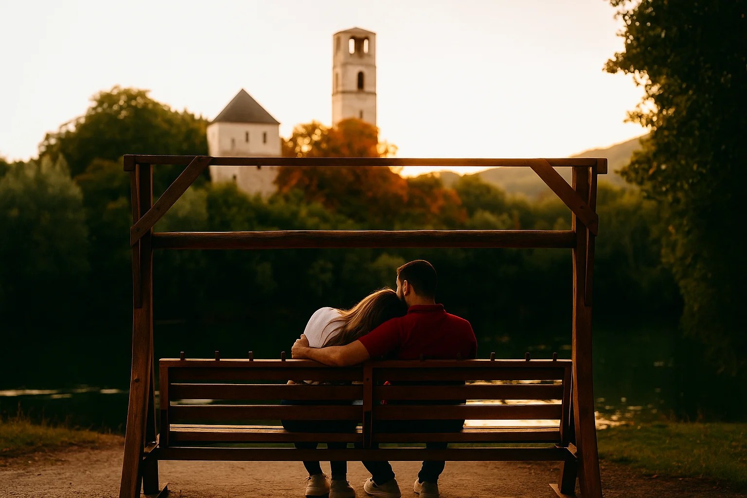 Ein friedlicher Moment eines Paares, das bei Sonnenuntergang am See sitzt. Die warme Abendsonne, die Natur und die alte Turmkulisse schaffen eine Atmosphäre voller Ruhe und Zuneigung.