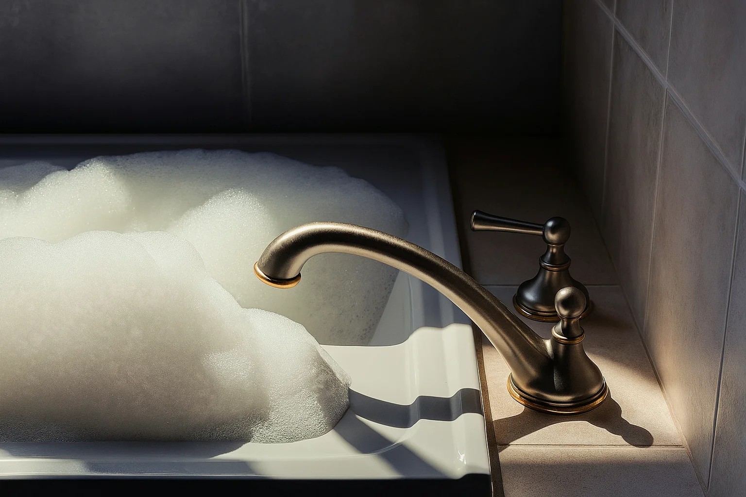 Ein detailliertes Foto eines mit Schaum überlaufenden Waschbeckens, das von Sonnenlicht beleuchtet wird und zusammen mit einem goldfarbenen Wasserhahn eine warme und ruhige Badezimmeratmosphäre erzeugt.
