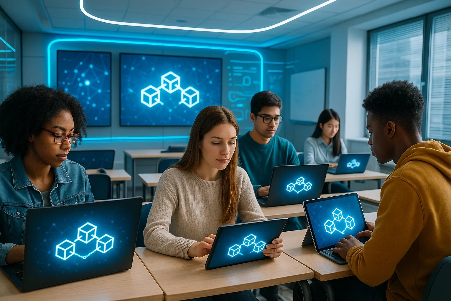 This image showcases the innovative use of blockchain in education; ideal for websites, blogs, and social media. Suitable for education-themed content.