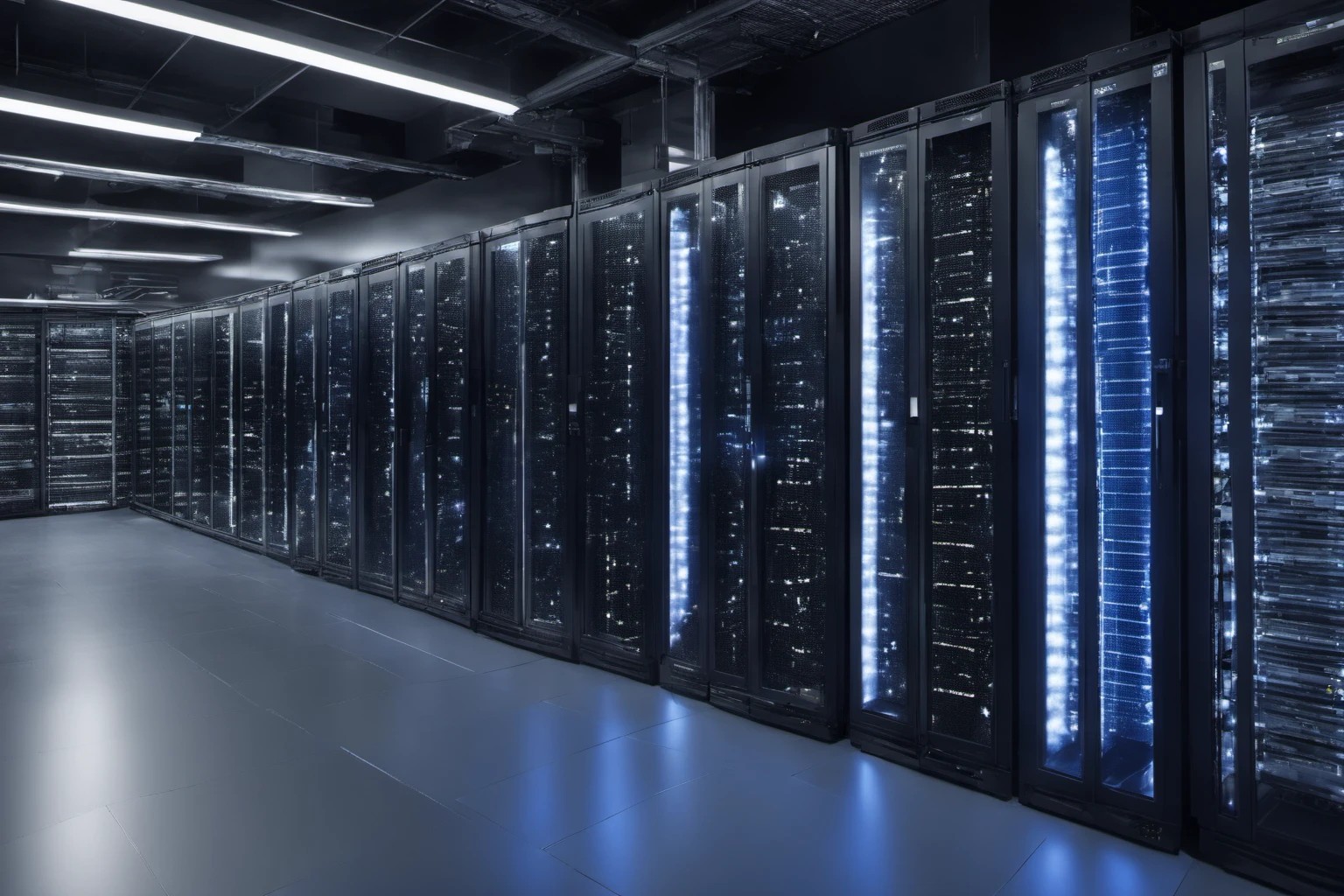 Close-up shot of rack-mounted servers in a modern data center, showcasing precision engineering and advanced cloud computing infrastructure. Ideal for technology showcases, business presentations, and IT solutions marketing materials. Usage: tech websites, business reports, cloud service promotions.