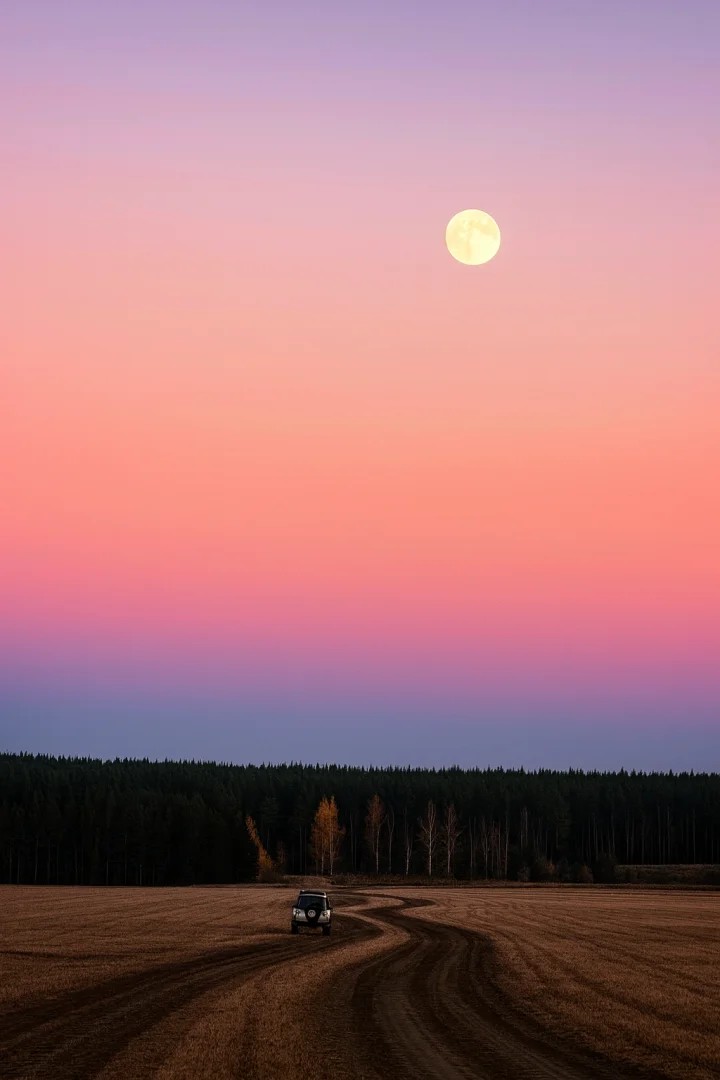 A peaceful landscape featuring a glowing full moon above a pink and purple sunset sky, with a vehicle driving along a winding rural road.