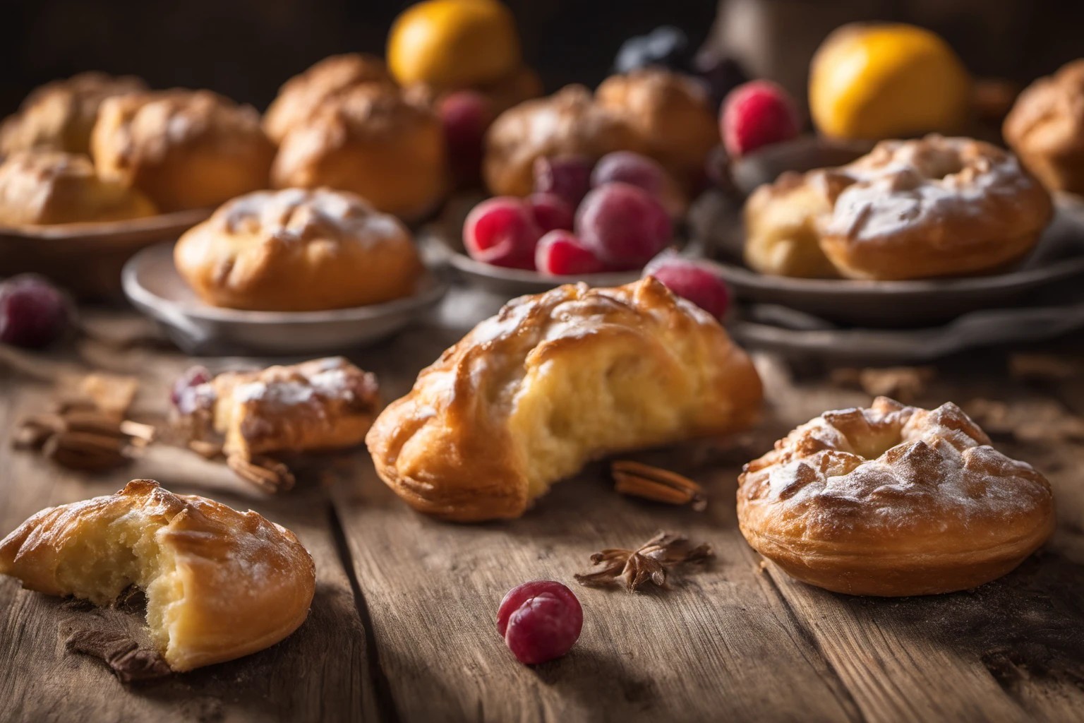 High-resolution gourmet bakery display showcasing fresh pastries with a warm, inviting light. The shot features vibrant colors and detailed textures of various baked goods arranged on a rustic wooden surface. Usage: e-commerce product pages, culinary magazines, marketing banners.