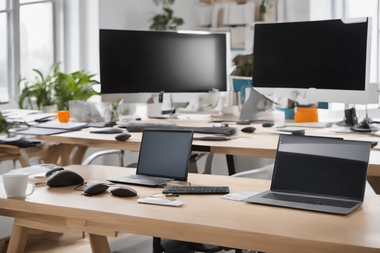 Professional shot of a sleek, modern office desk setup featuring the latest tech equipment. Includes high-resolution monitor, ergonomic keyboard, and smart devices in clean white space with soft lighting. Usage: e-commerce product pages, corporate websites, marketing banners.