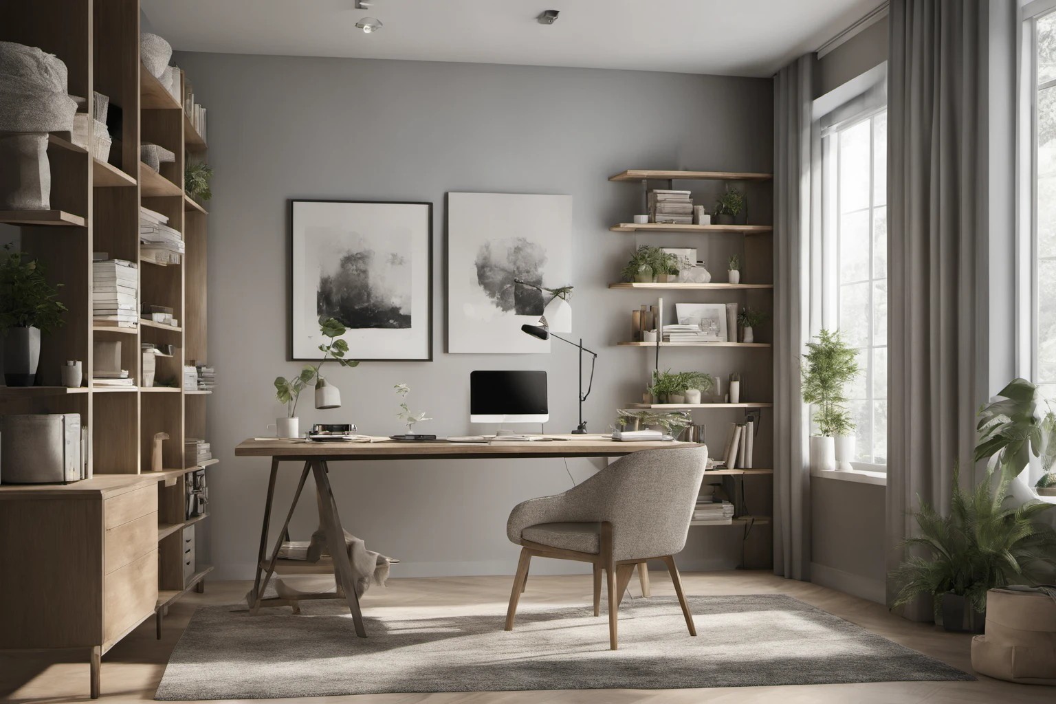 Professional photography of a modern small office layout featuring sleek furniture, natural light, and open space. Ideal for showcasing contemporary workspace design with minimalist aesthetics. Usage: e-commerce product pages, interior design portfolios, marketing banners.