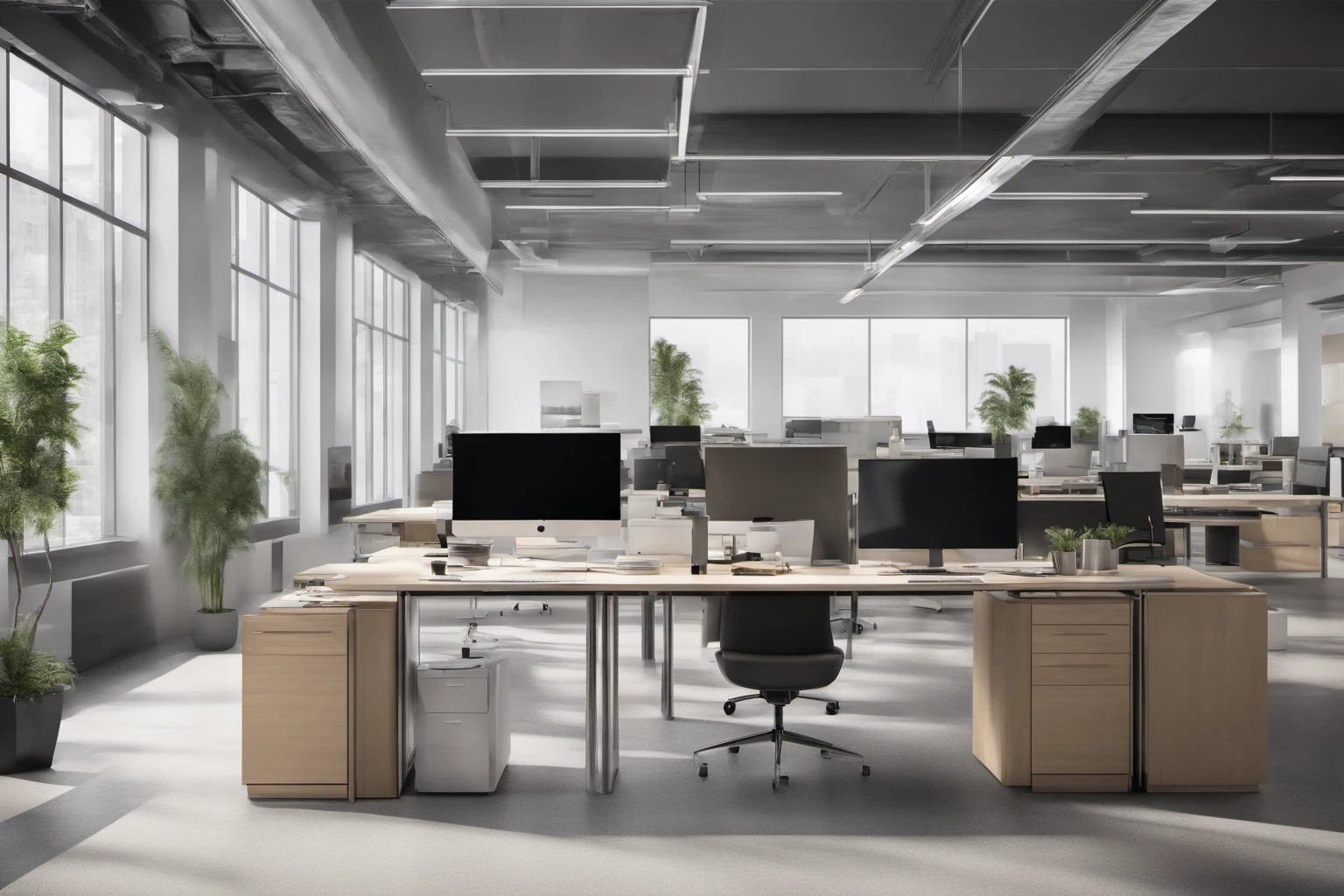 Professional image of a sleek modern tech office, showcasing minimalistic design with open spaces, natural light, and state-of-the-art equipment. Ideal for capturing the essence of contemporary work environments. Usage: e-commerce product pages, interior design portfolios, marketing banners.