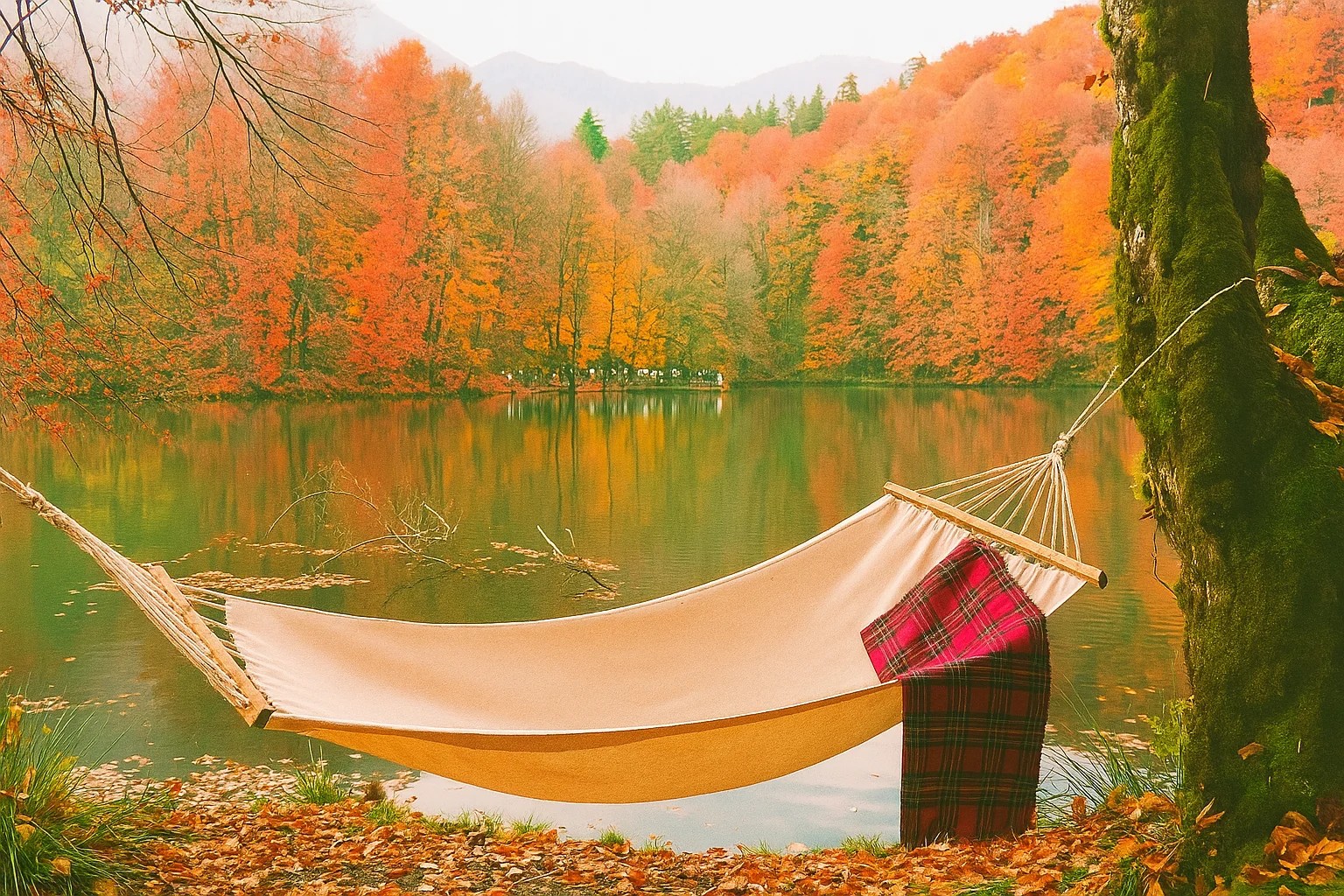 Surrounded by the warm colors of autumn, this hammock by the lake offers a peaceful retreat in nature’s calm.
