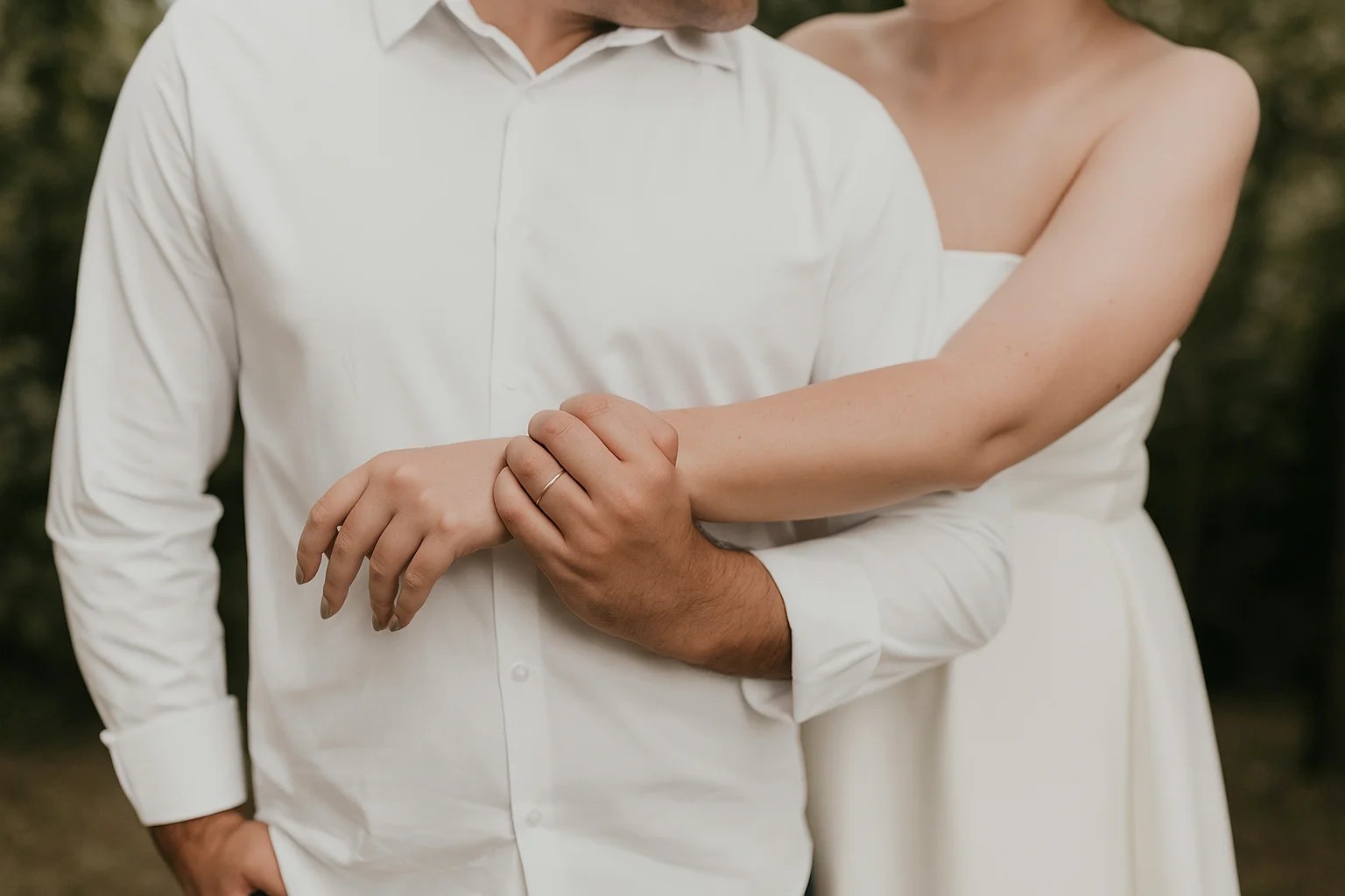 A newlywed couple shares a tender, minimalist moment. The bride’s delicate ring and soft bouquet intertwine with the groom’s hand, symbolizing love, unity, and timeless connection.