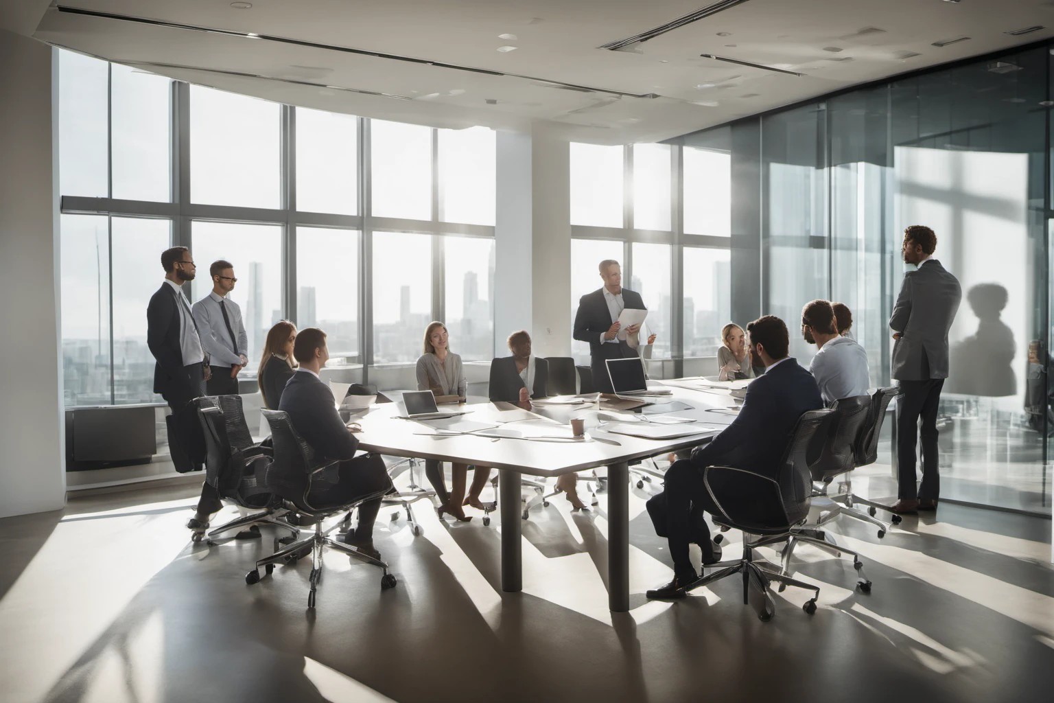 Elegant professional image of a modern team meeting in an expansive conference room, featuring crisp whiteboard discussions and natural light. Usage: corporate websites, team presentation slides, office marketing.