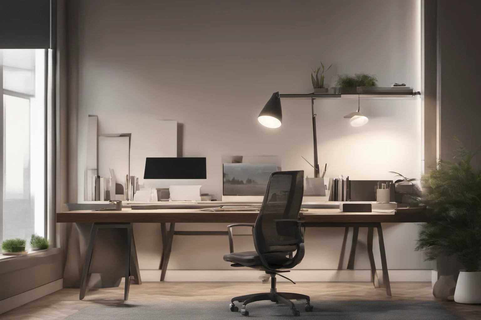 Imagen profesional de un escritorio elegante con decoración minimalista, líneas claras y mobiliario moderno. Ideal para blogs de diseño de oficinas corporativas y materiales de marketing.