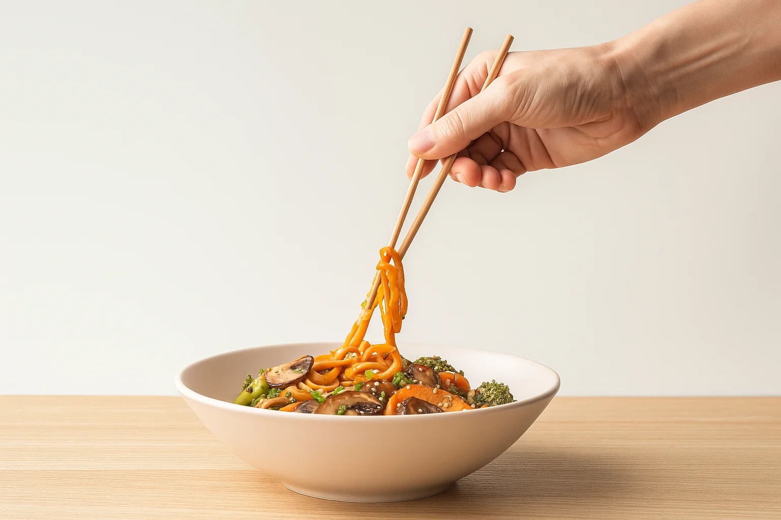 Un plato de fideos al estilo asiático con verduras y salsa, servido sobre un fondo blanco. Esta foto gastronómica minimalista refleja la elegancia de la cocina asiática.