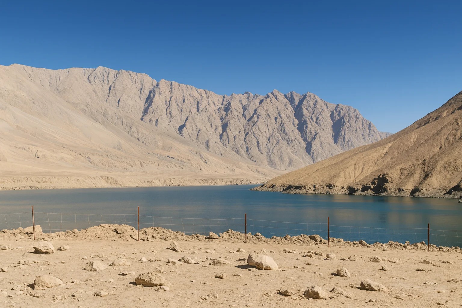 Un lago claro se extiende al pie de montañas áridas y rocosas, creando una vista natural simple y tranquila.