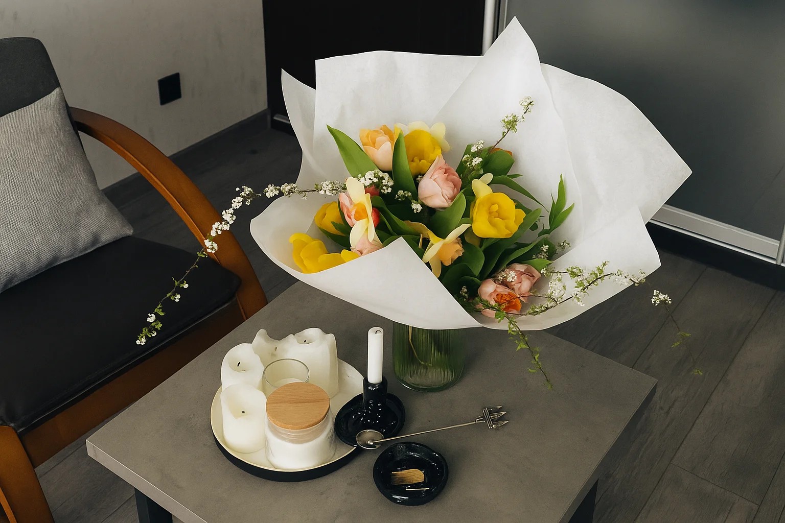 En una sala moderna, un ramo de flores vibrantes y elegantes velas sobre una mesa gris minimalista crean un ambiente tranquilo y acogedor.
