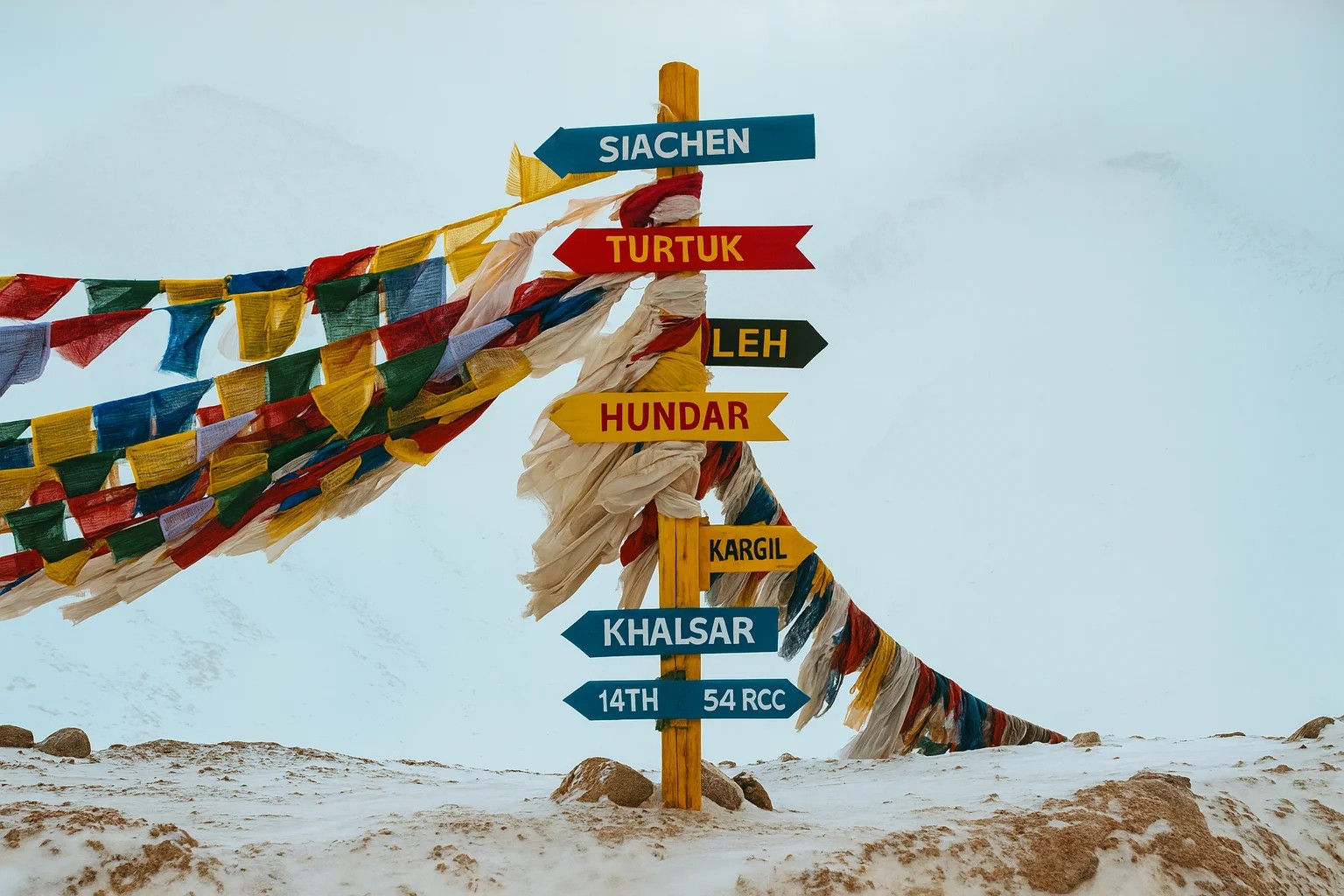 Una escena llamativa con señales de dirección coloridas y telas ondeando al viento en un paso de montaña cubierto de nieve.