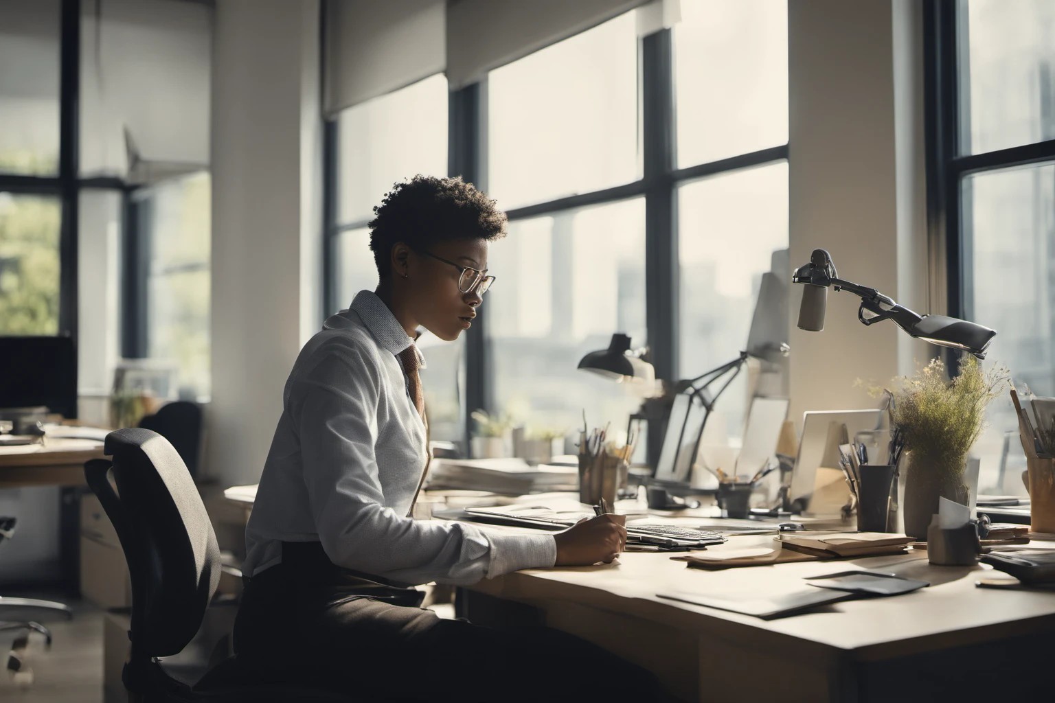 Image haute qualité d'un aménagement de bureau moderne présentant des électroniques élégants, des carnets et des plantes vivaces. Une lumière naturelle met en valeur les éléments de productivité tels que les livres et les lampes de travail. Usage: sites e-commerce, blogs sur le design intérieur, présentations d'entreprise.