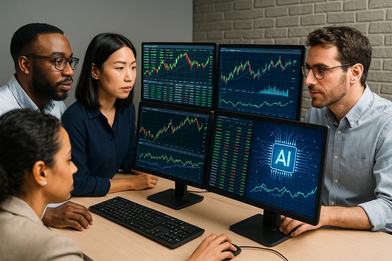 Cette image montre l'utilisation de l'IA dans l'analyse financière; idéale pour sites web, blogs et réseaux sociaux. Convient pour le contenu à thème financier.