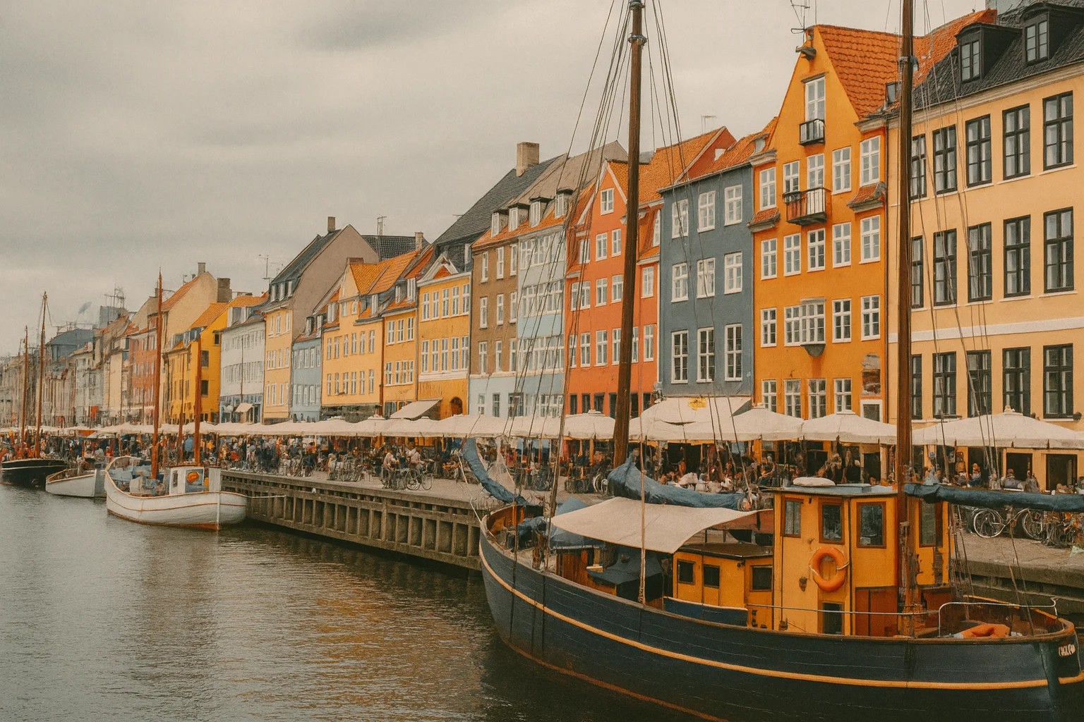 Photo de paysage urbain montrant des bâtiments historiques et colorés le long du canal, des bateaux amarrés au bord de l’eau et l’activité des passants. La surface de l’eau et les détails architecturaux complètent la scène.