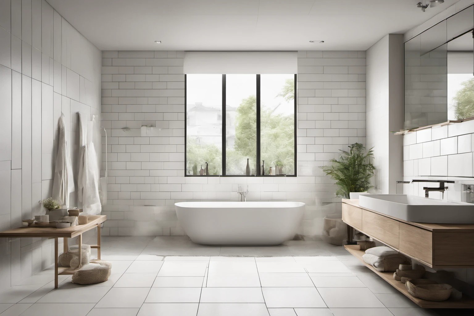 Fotografi profesional menampilkan ubin kamar mandi berdesain chic untuk area sempit, dengan pola geometris dan nada netral. Ideal untuk solusi penyimpanan cerdas dan perabotan modern. Usage: halaman produk e-commerce, portofolio desain interior, banner pemasaran.