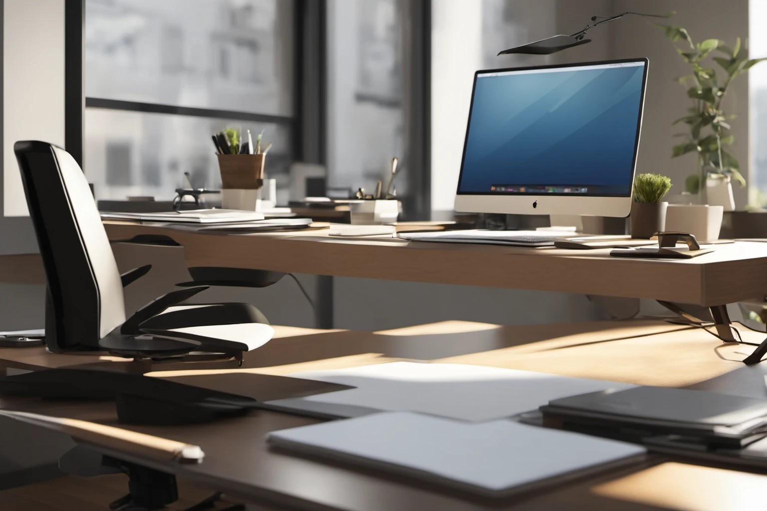 Gambar profesional dari setup meja kantor modern dengan garis halus dan sedikit barang berantakan, cocok untuk menampilkan lingkungan kerja profesional. Usage: halaman produk e-commerce, portofolio desain interior, branding ruang konferensi.