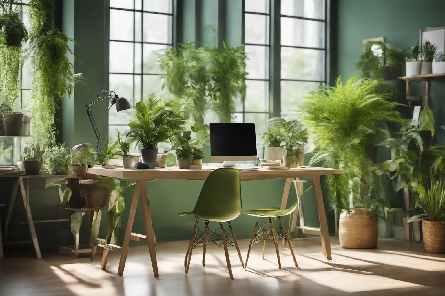 Gambar resolusi tinggi ruang kantor modern dengan tanaman hijau indoor, pencahayaan alami, dan furnitur ramping. Ideal untuk proyek branding ramah lingkungan dan laporan keberlanjutan. Usage: branding, laporan keberlanjutan, wisata kantor