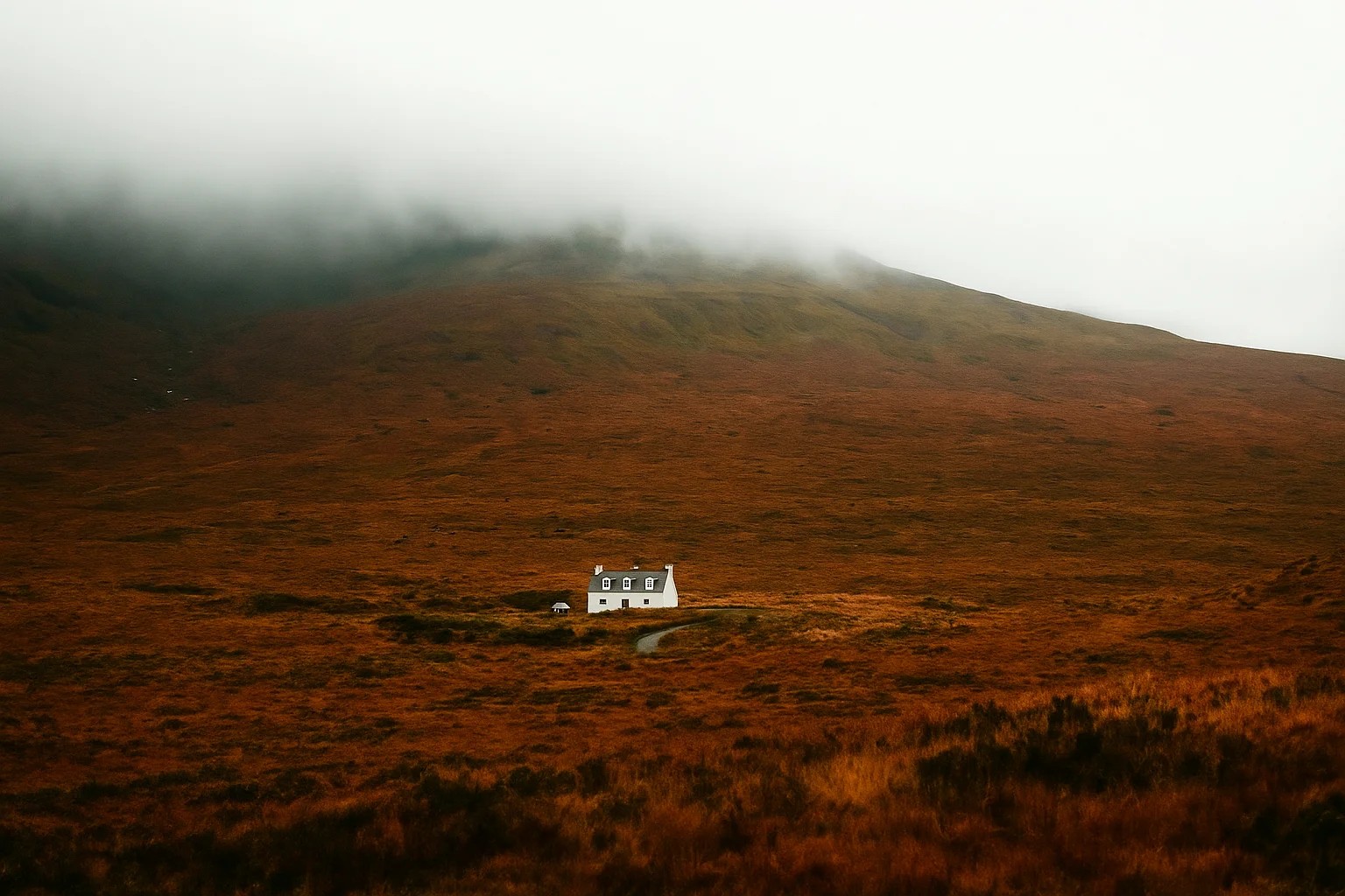 Gambar ini menunjukkan rumah putih kecil yang berdiri sendiri di kaki gunung berkabut. Dataran luas berwarna oranye dan coklat menggambarkan ketenangan alam.