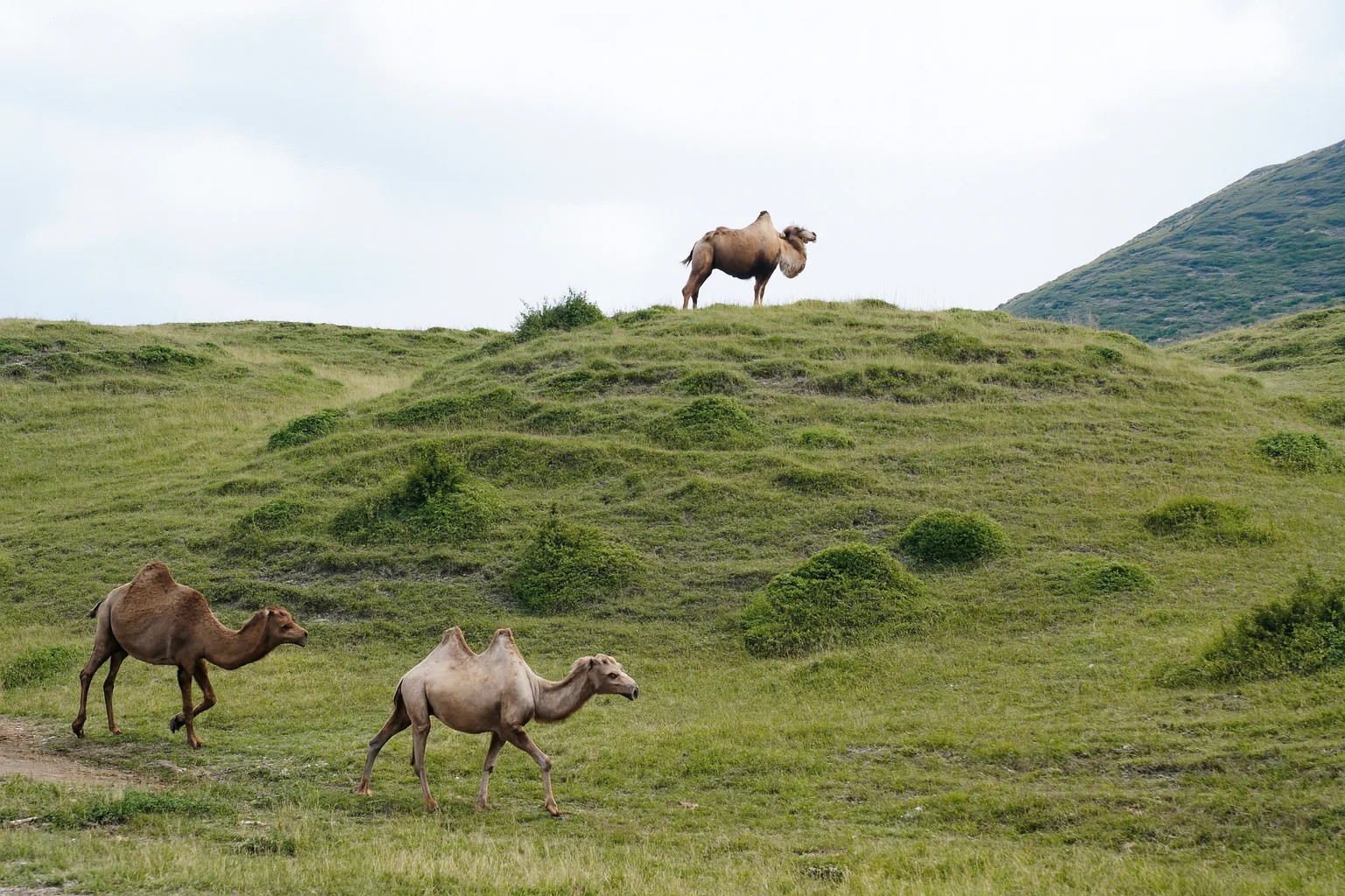 Una scena tranquilla che mostra diversi cammelli che si muovono liberamente tra dolci colline verdi ricoperte d’erba.