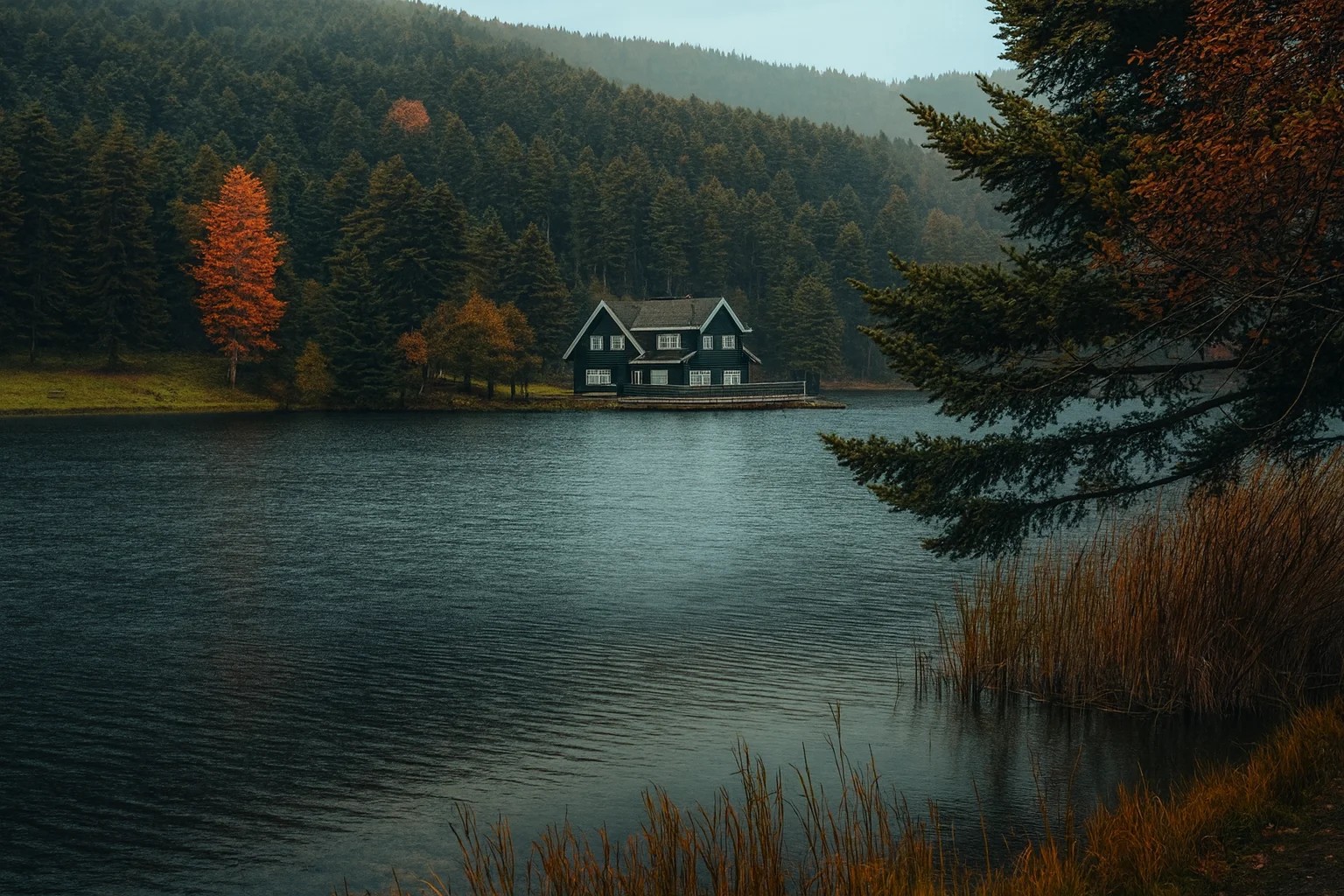 Questa foto mostra una casa immersa nel bosco sulla riva di un lago tranquillo in un clima nebbioso. Circondata da pini, la casa dai toni scuri si distingue per la sua atmosfera serena e i colori autunnali attorno.