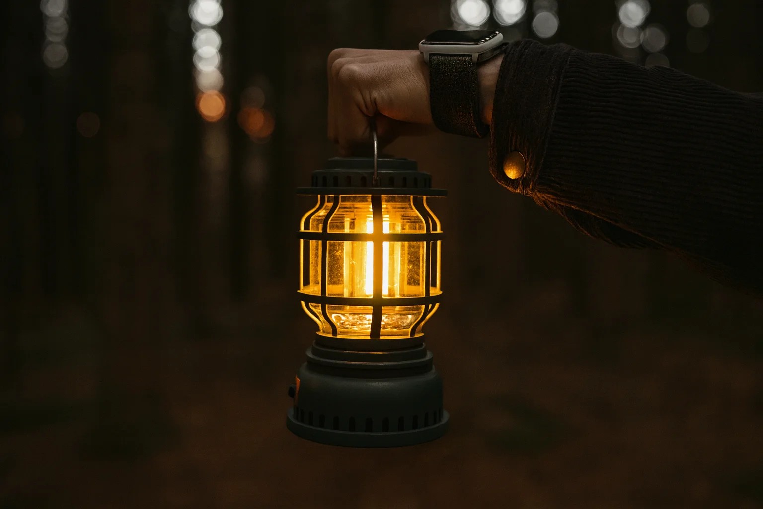 Una foto calda e drammatica che mostra una persona che tiene una lanterna luminosa in una foresta buia.