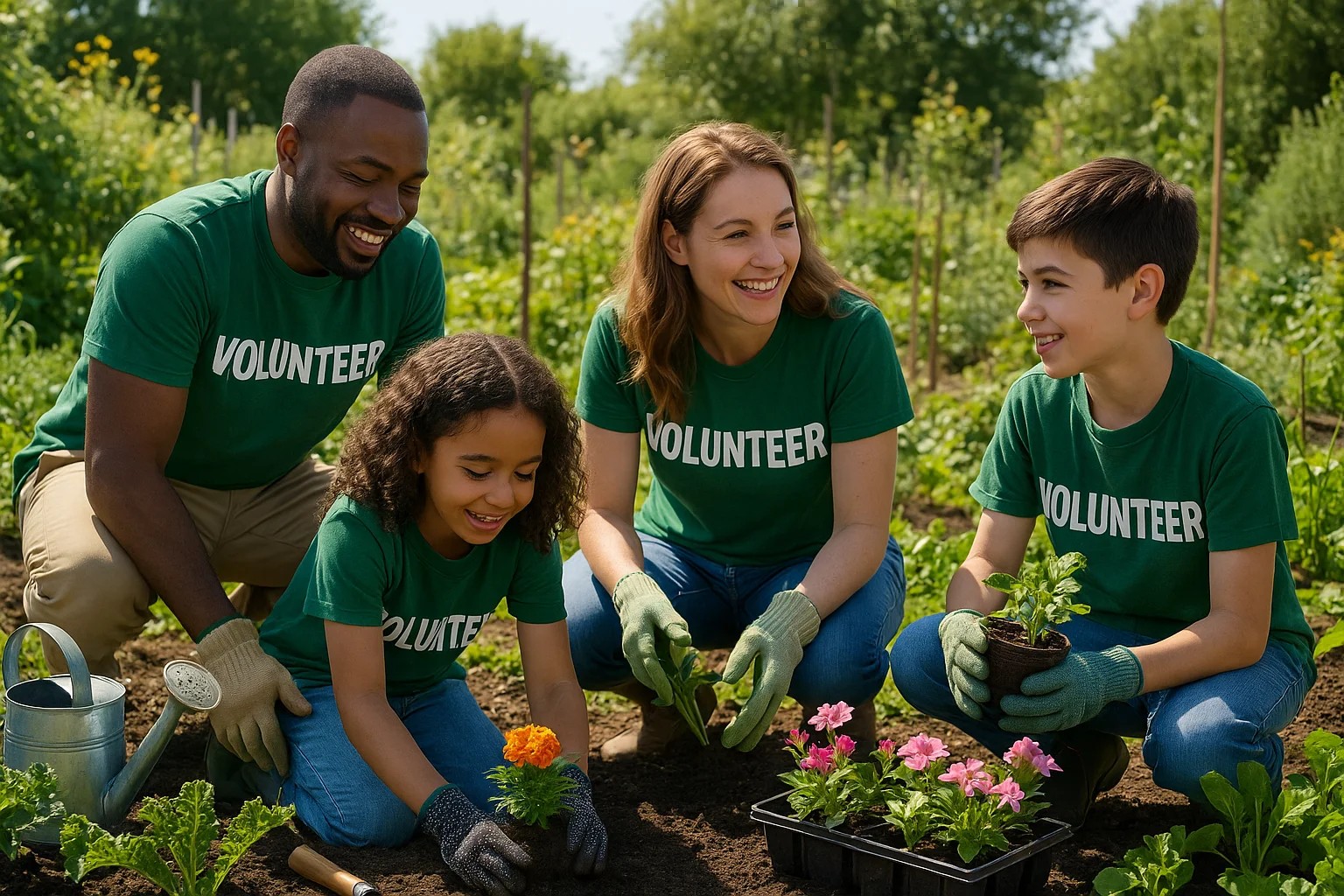 Questa immagine è perfetta per siti web, blog e post sui social media che promuovono il volontariato nei giardini comunitari. Adatta per contenuti a tema familiare.