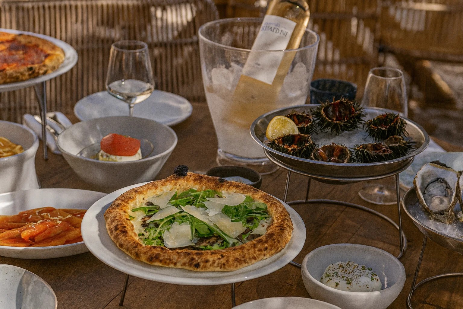 屋外の木製テーブルに、グルメピザ、新鮮なシーフード、前菜、冷えた白ワインが美しく並べられた上質なダイニングシーン。