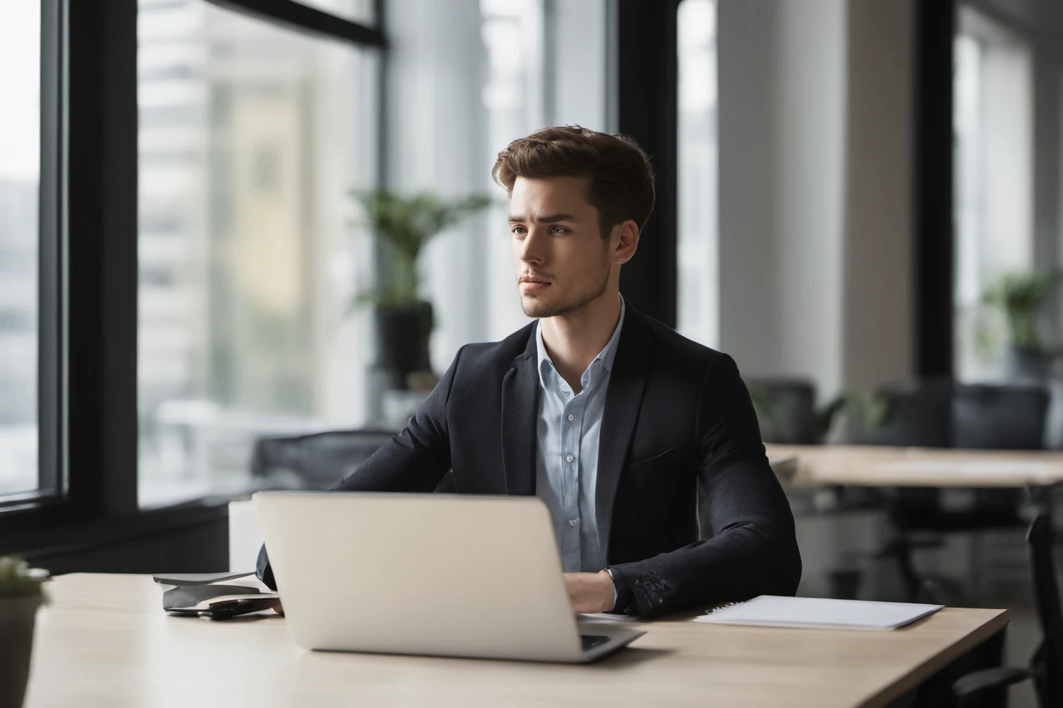 若い起業家のプロフェッショナルなポートレート。デスクで真剣に仕事に打ち込む様子を捉えた魅力的な写真。