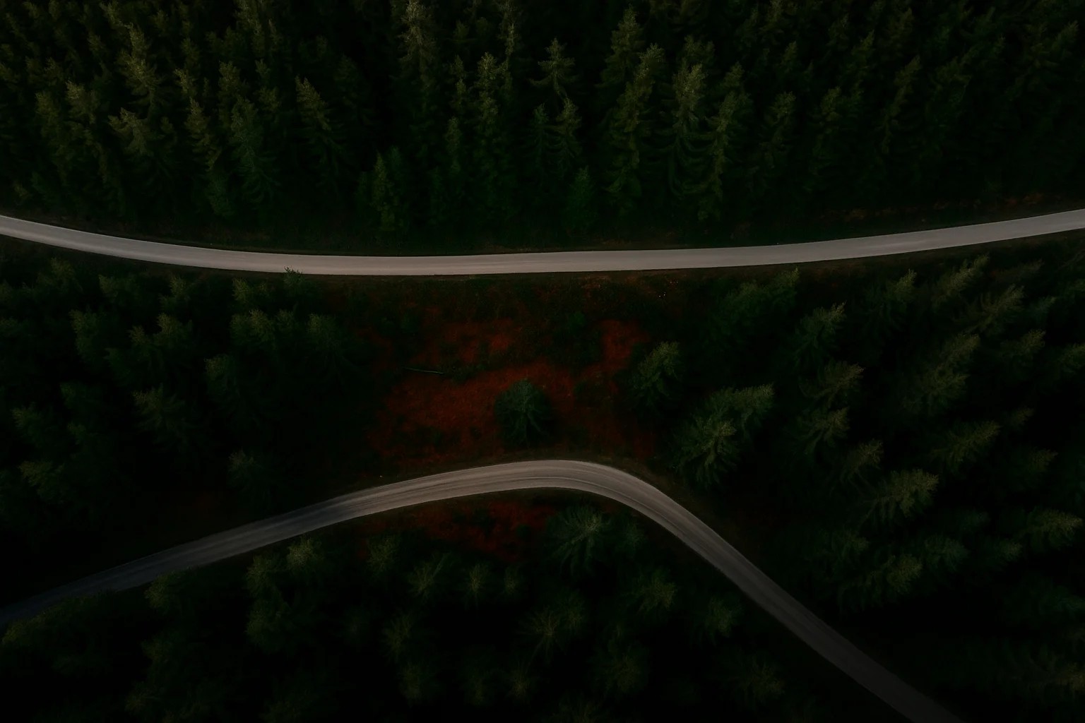 一条穿越茂密绿色森林的蜿蜒公路,从空中俯瞰,展现宁静与自然的和谐美。