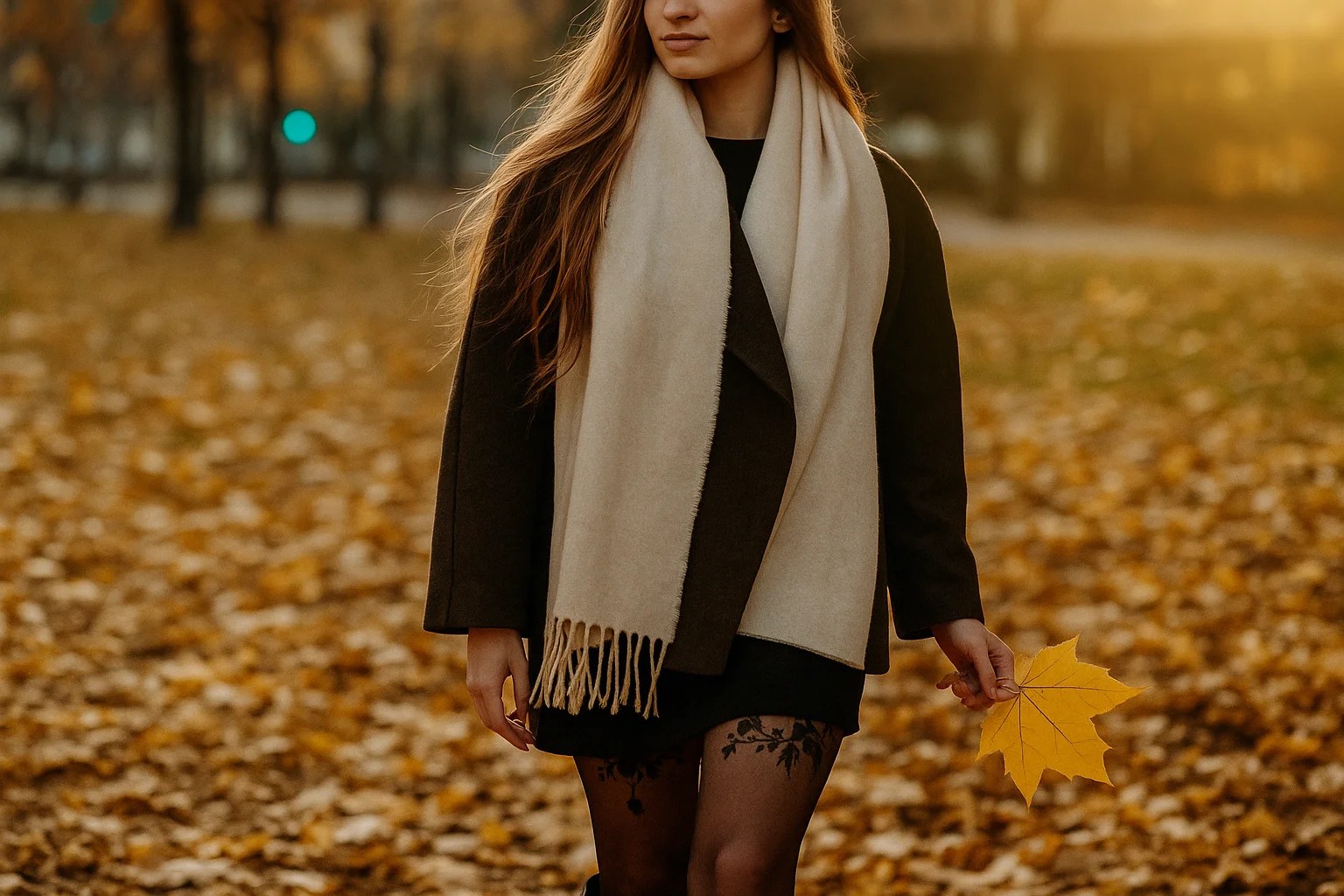 Uma mulher caminhando entre folhas amarelas de outono em um parque, segurando uma folha enquanto a luz quente cria uma atmosfera tranquila.