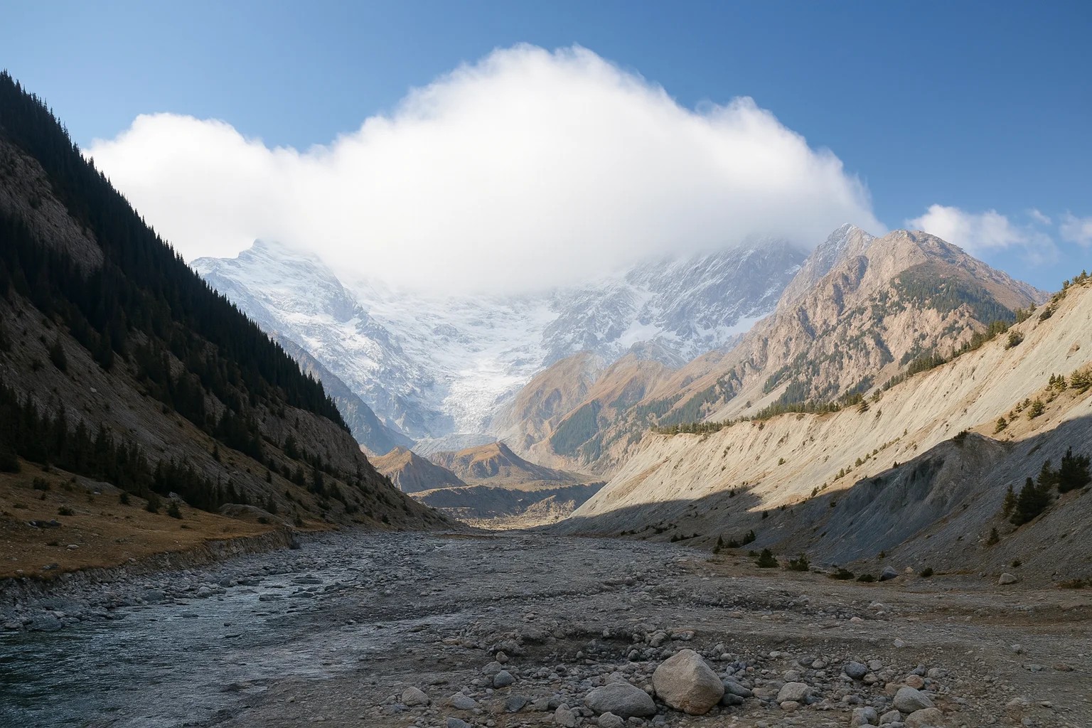 Uma foto dramática mostrando um vale rochoso que leva a montanhas altas parcialmente cobertas por nuvens.