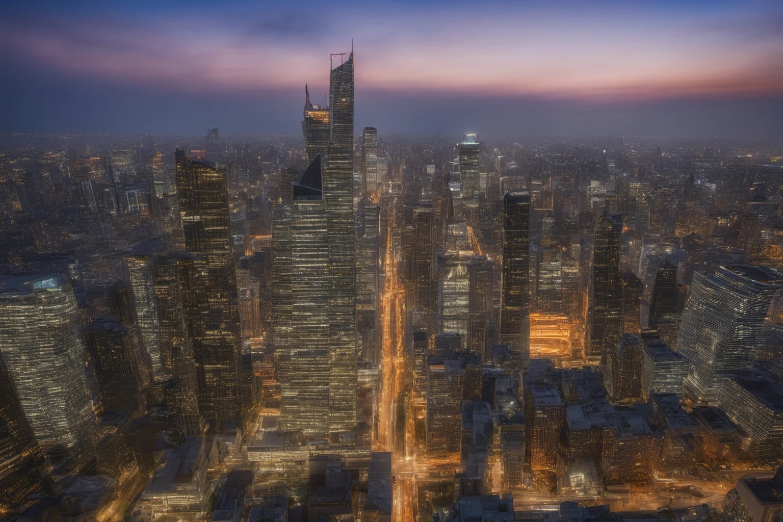 Fotografia aérea profissional destacando o skyline urbano com prédios elegantes e designs arquitetônicos inovadores iluminados pela suave luz da manhã. Usage: projetos de paisagem urbana, portfólios de arquitetura, marketing imobiliário.