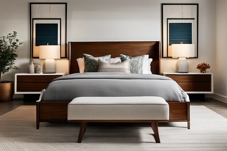 Renovação impecável de um quarto principal luxuoso com texturas ricas, iluminação aconchegante e decoração sofisticada. Ideal para listagens imobiliárias de alto padrão, revistas de design de interiores e mostruários de móveis premium.
