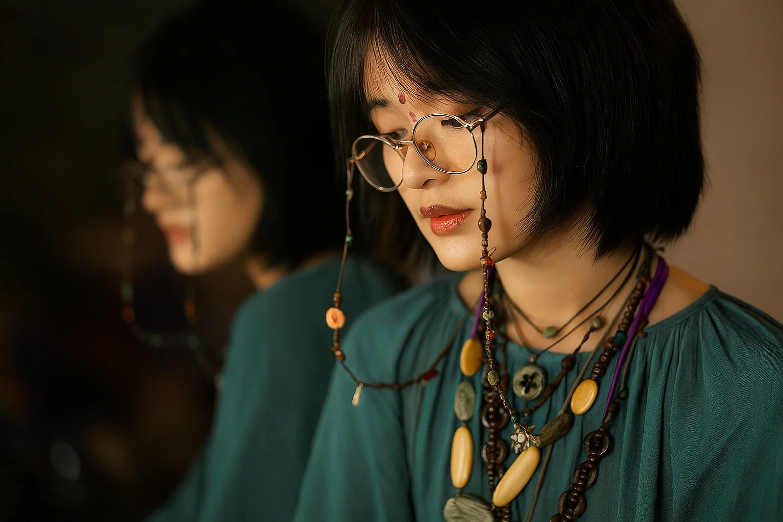 Uma mulher de óculos e colares coloridos observa pensativamente seu reflexo no espelho. A luz suave e os tons naturais dão calor e arte à fotografia.