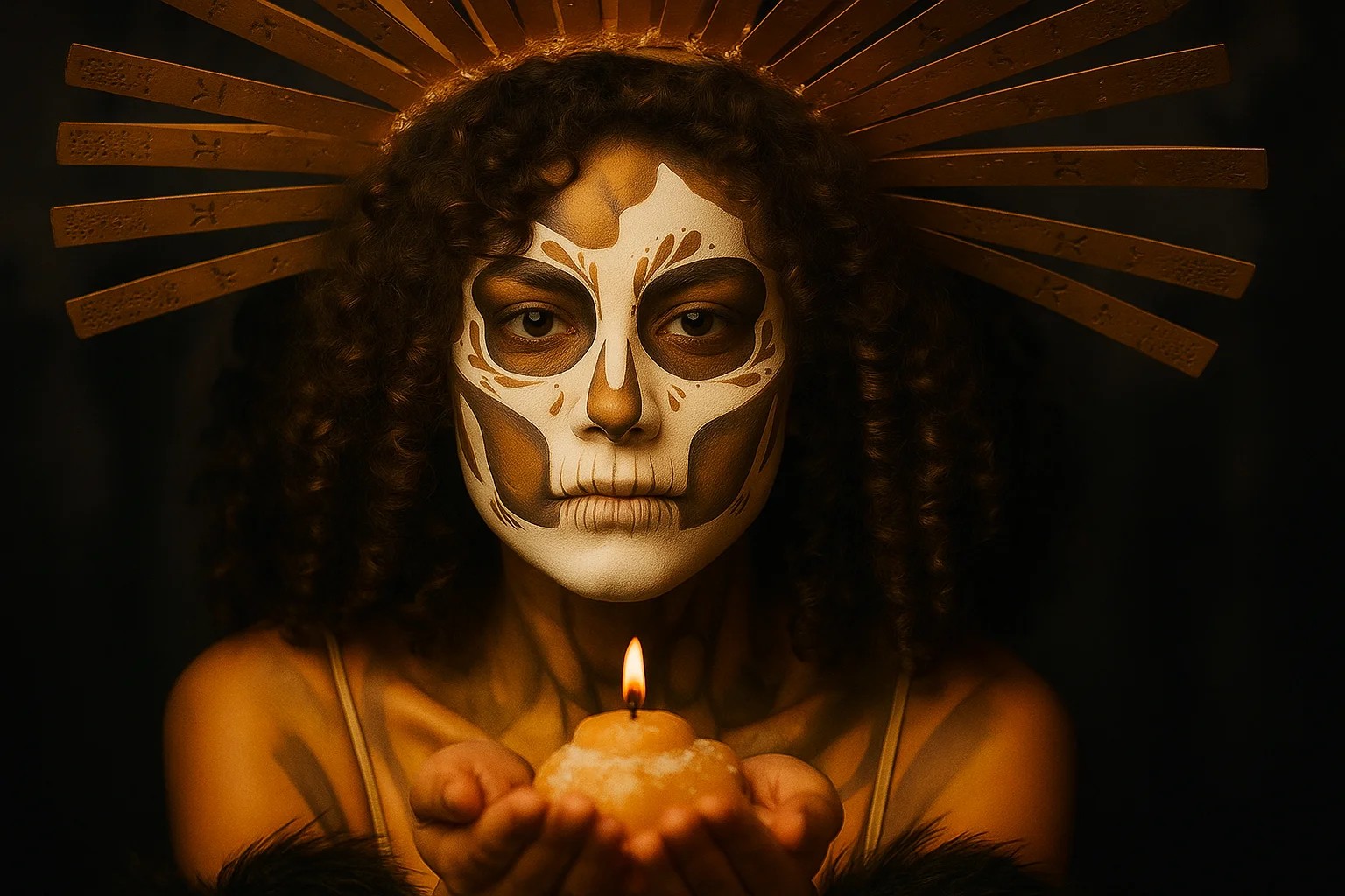 Retrato artístico de uma mulher com maquiagem de caveira segurando uma vela sob luz dourada. Evoca mistério e elegância.