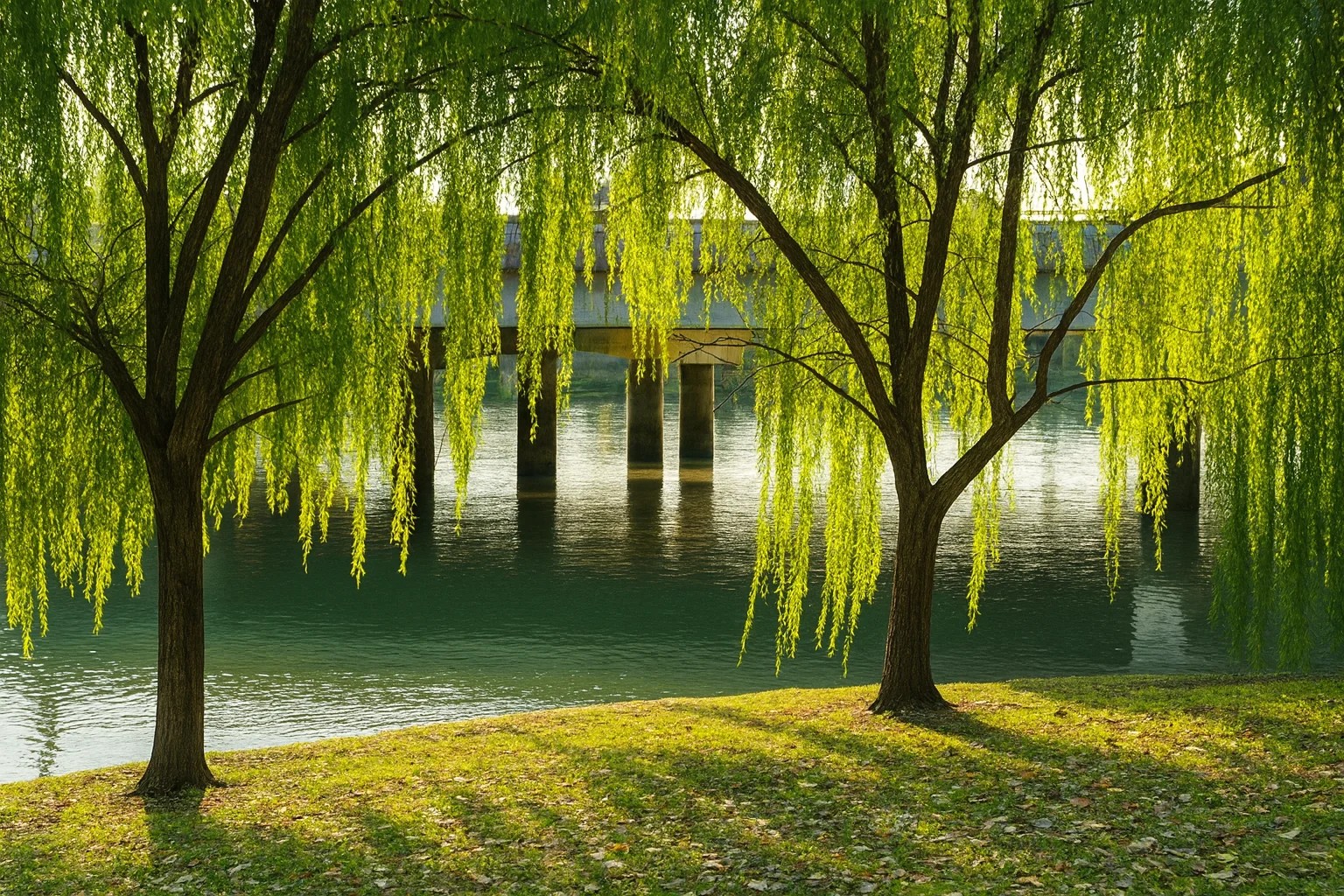 A imagem mostra dois salgueiros brilhando sob a luz do sol, em harmonia com a paisagem tranquila à beira do rio. Os reflexos na água e os pilares da ponte trazem profundidade e suavidade.