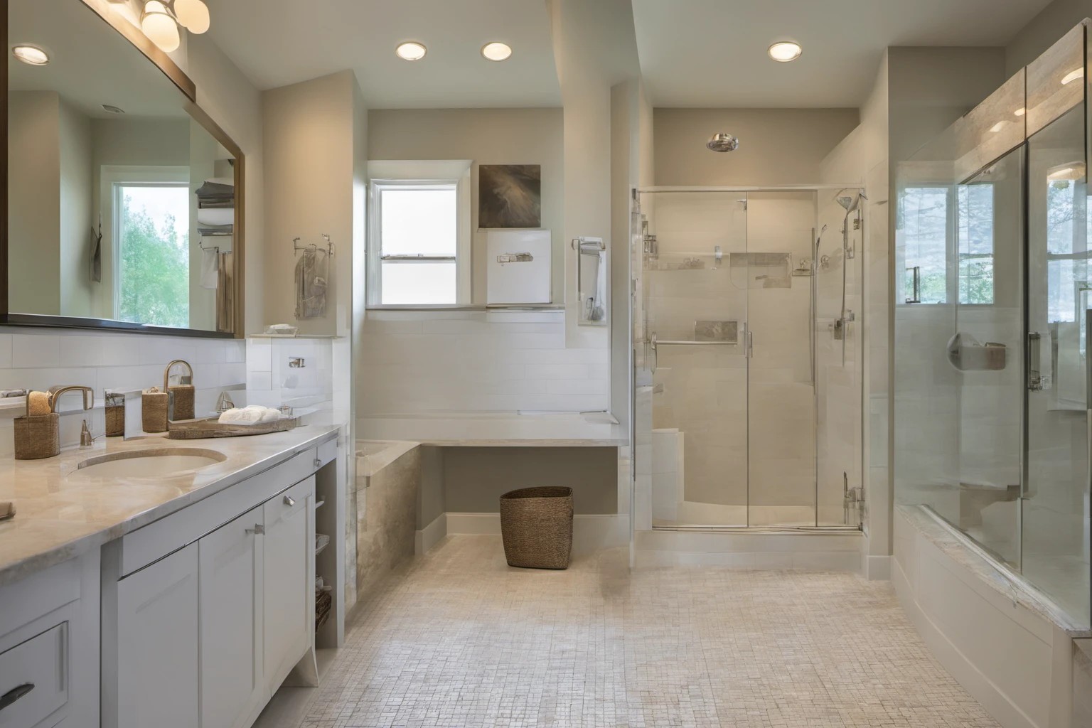 Профессиональные фотографии до-после бюджетного ремонта ванной, демонстрирующие современные сантехнические приборы и элегантные финишные материалы. Яркое освещение подчеркивает трансформацию от устаревшего к современному дизайну. Применение: блоги по ремонту дома, портфолио ремонтных работ, социальные сети.