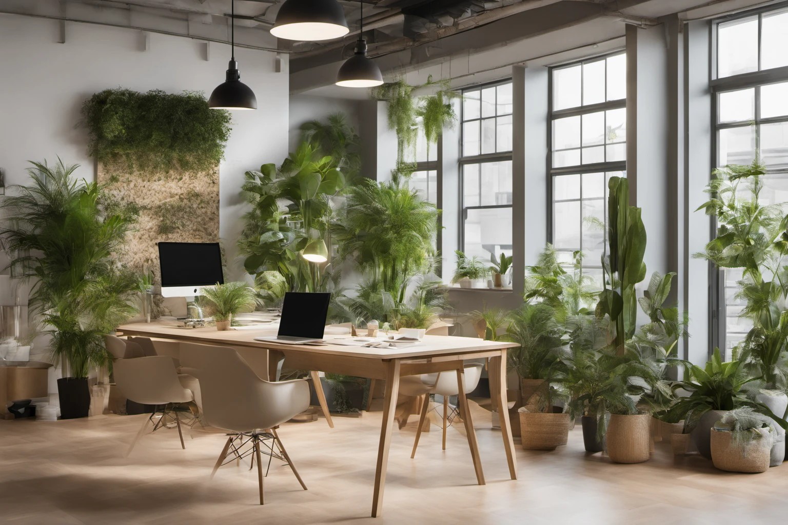Профессиональное изображение современного офиса стартапа с зелёными растениями, деревянными столами и ярким декором. Уютное освещение создаёт продуктивную атмосферу. Использование: e-commerce, портфолио дизайнеров интерьеров, маркетинговые баннеры.