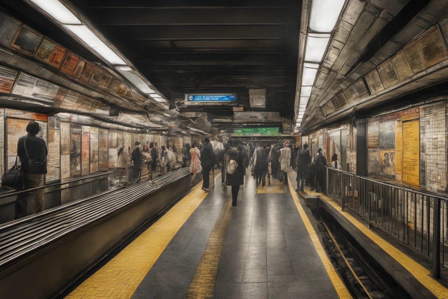 Яркое изображение переполненной подземной станции во время часа пик, демонстрирующее разнообразные взаимодействия между пассажирами и сложную архитектуру. Использование: реклама общественного транспорта, журналы городского ландшафта, блоги о путешествиях.