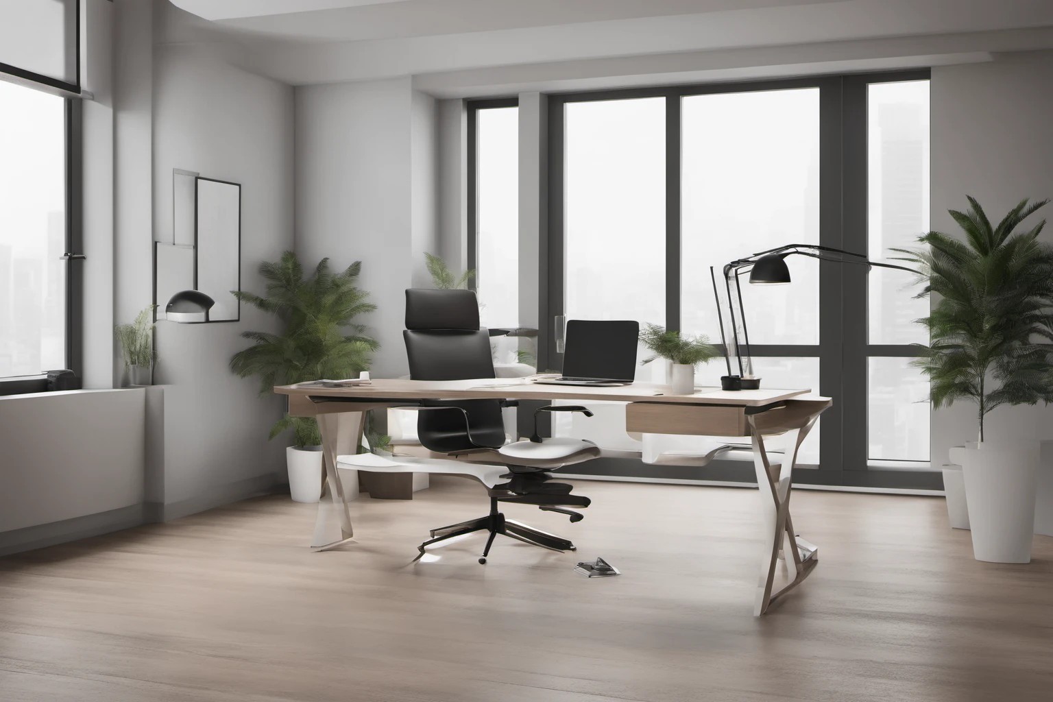 Профессиональный образ современного рабочего места с минималистичным ноутбуком, эргономичным стулом и аккуратной рабочей областью под мягким естественным светом. Usage: шаблоны для веб-дизайна, корпоративное брендингирование, блоги по интерьерному дизайну.