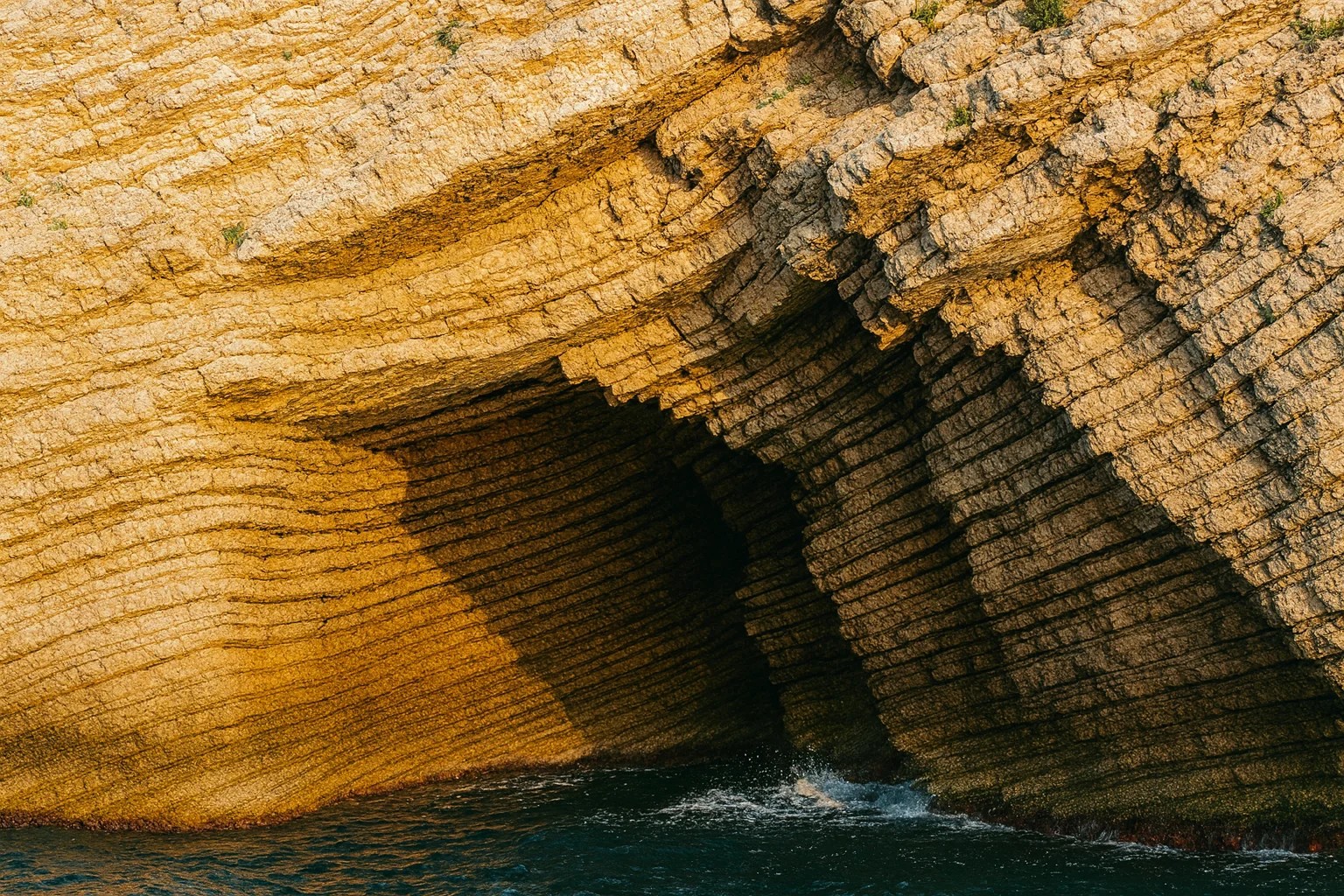 Яркий солнечный свет подчеркивает слоистую структуру скалы, плавно переходящей в прибрежную морскую пещеру, созданную волнами. Пейзаж передает силу природы.