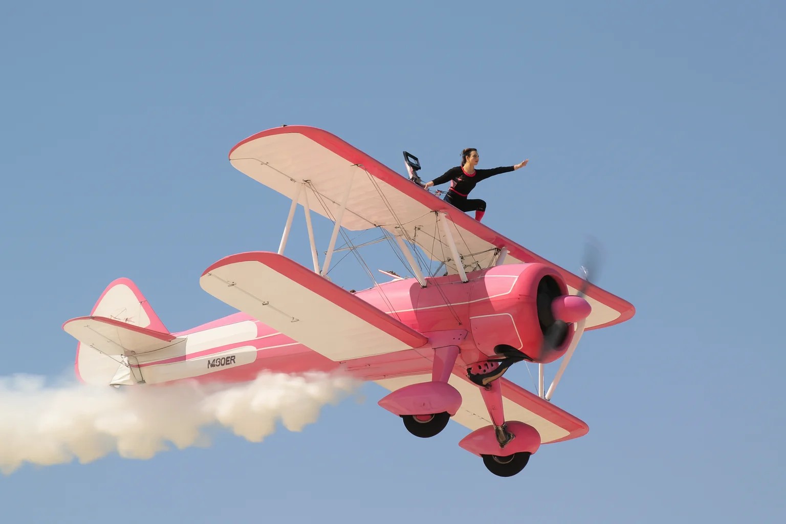 Фотография авиашоу, на которой вингвокер в страховочном снаряжении выполняет номер на крыле розового биплана в полёте. Детали самолёта, дымовой след и голубое небо дополняют композицию.