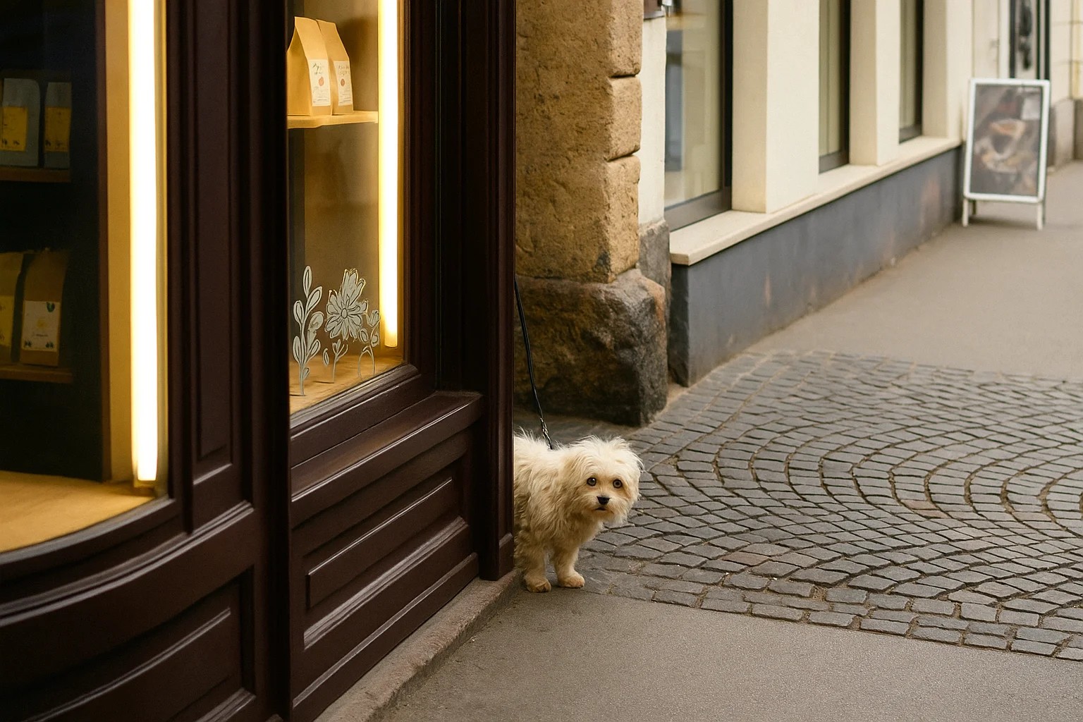 Kaldırım taşlarıyla kaplı dar bir sokakta, dükkanın köşesinden meraklı gözlerle bakan küçük beyaz bir köpek. Sıcak ışıklar ve nostaljik atmosfer, şehir yaşamının sade güzelliğini yansıtıyor.