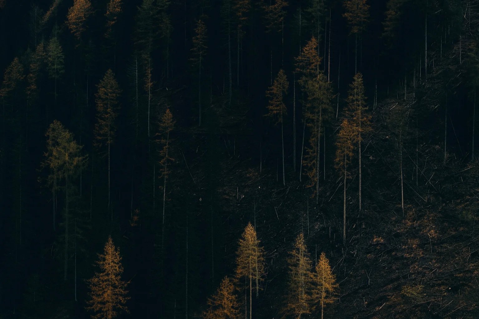 Yoğun ve karanlık bir orman içinde yükselen altın sarısı yapraklı ağaçlar, sonbaharın dramatik ve büyüleyici atmosferini yansıtıyor. Işık ve gölgelerin çarpıcı kontrastı, doğanın doğal güzelliğini ortaya çıkarıyor.