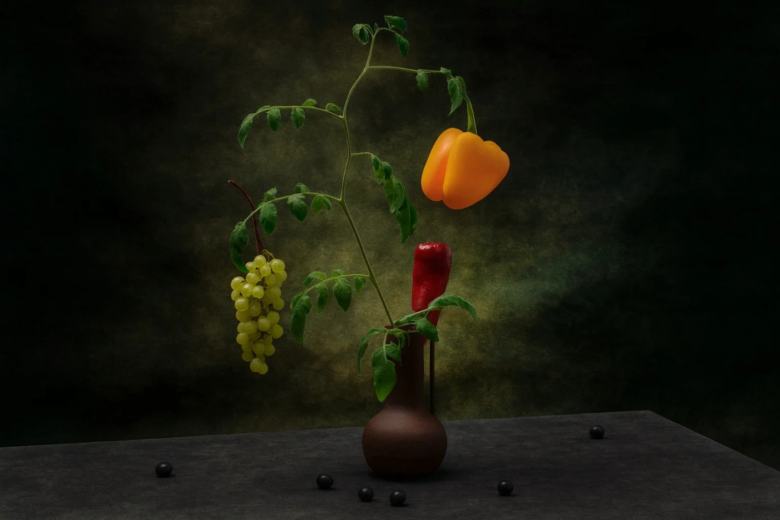 Koyu tonlu bir arka plan önünde, vazoya yerleştirilmiş bir bitki dalı üzerinde sarı üzümler, turuncu dolmalık biber ve kırmızı biberin dengeli bir şekilde sergilendiği sanatsal bir natürmort kompozisyonu. Işık-gölge kontrastı, ürünlerin dokusunu ve renklerini öne çıkarıyor.