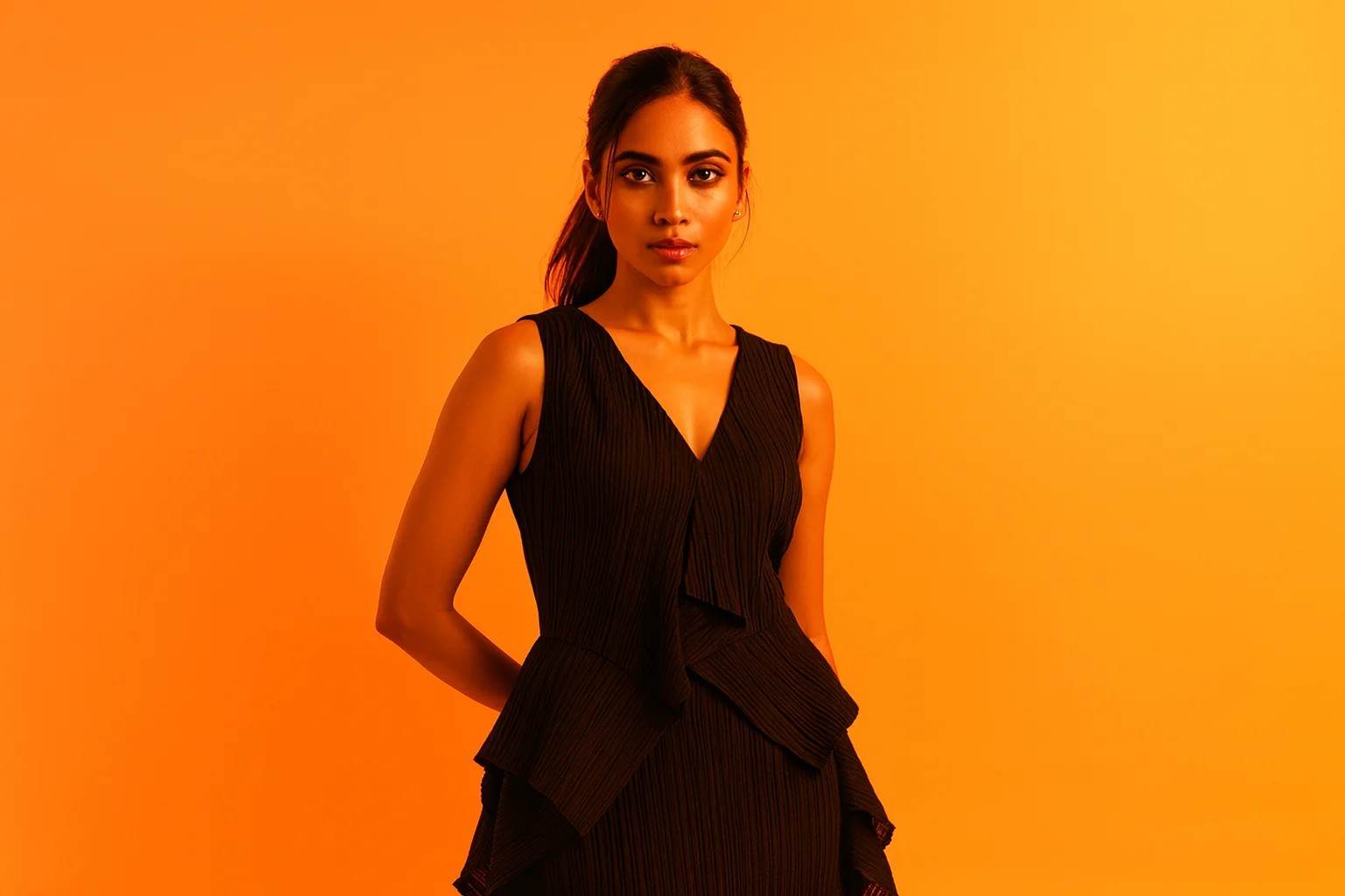 Turuncu tonlarda aydınlatılmış bir arka plan önünde siyah elbiseli bir kadının modern ve etkileyici portresi.